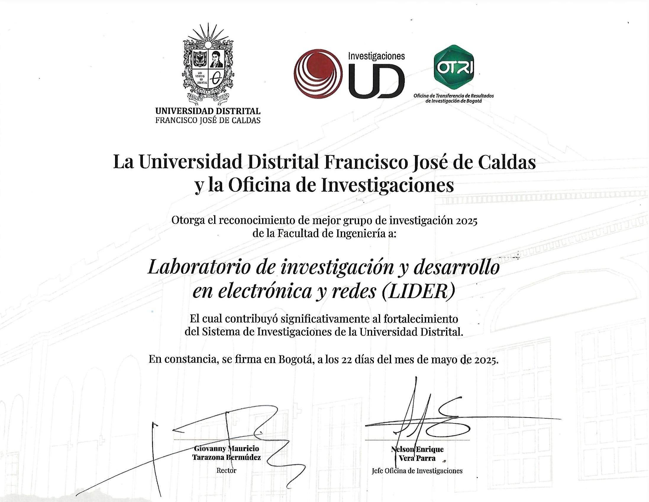 El pasado 22 de mayo de 2025, durante la ceremonia de reconocimiento a los mejores grupos de investigación de la Universidad Distrital Francisco José de Caldas, el Laboratorio de Investigación y Desarrollo en Electrónica y Redes (LIDER) fue distinguido con el título de mejor grupo de investigación 2025 de la Facultad de Ingeniería.